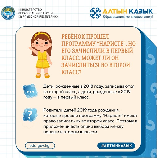 Если дети 2019-го прошли 480-часовую программу подготовки к школе «Наристе», то они тоже могут пойти во второй класс. Для этого дошкольные организации должны внести информацию в электронную базу balalyk.edu.gov.kg.